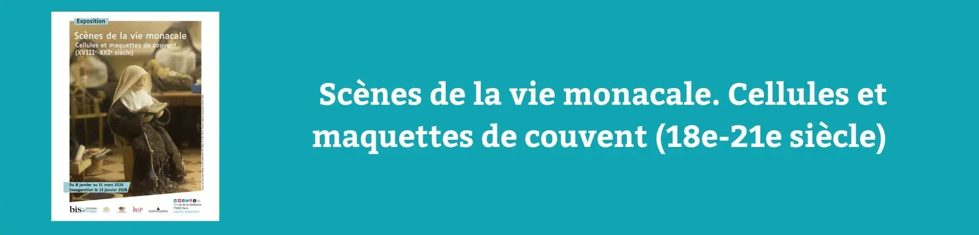 L'exposition "Scènes de la vie monacale. Cellules et maquettes de couvent (XVIIIe-XXIe siècle)" reprend 34 photographies issues du dernier ouvrage dirigé par Élisabeth Lusset et Isabelle Heullant-Donat, "Une vie en boîte" (https://www.editionsdelasorbonne.fr/produit/1101/9791035110000/une-vie-…), publié aux Éditions de la Sorbonne en 2025.